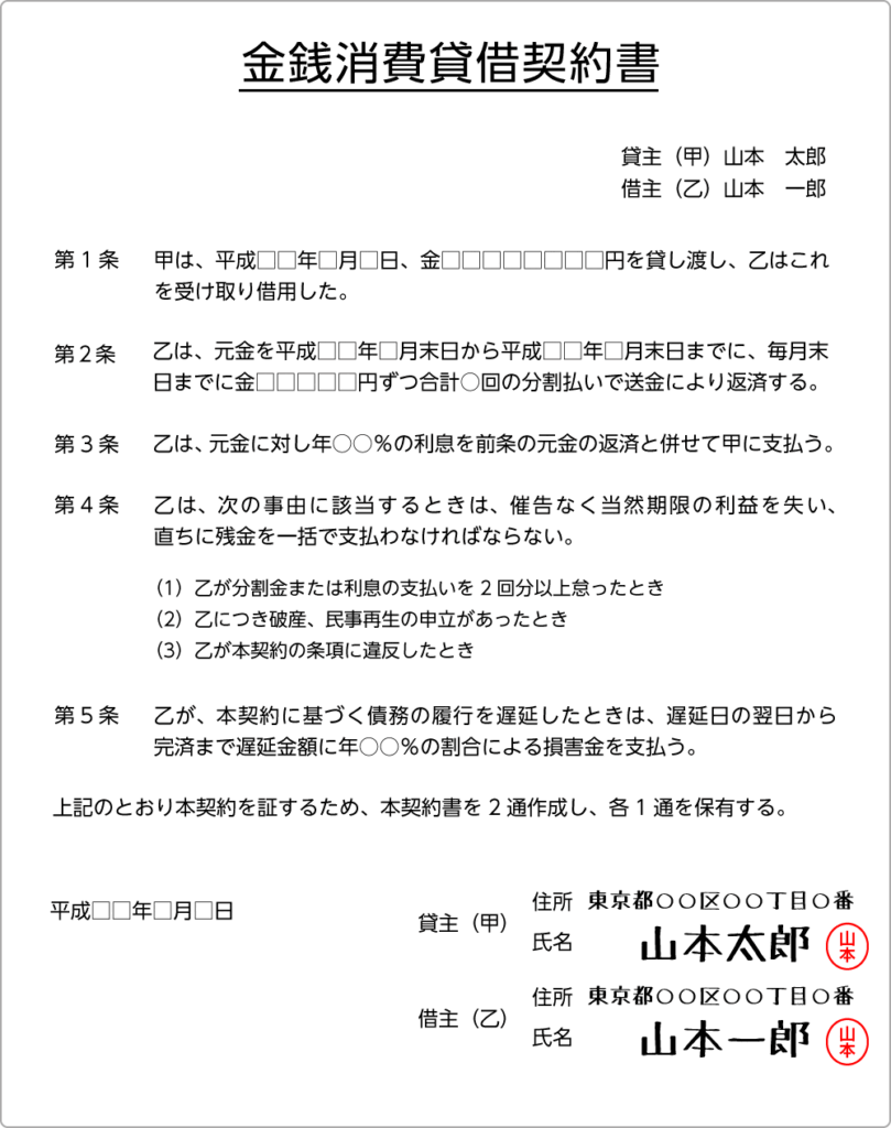- 遅延損害金: 返済が遅れた場合のペナルティについて定めておきます。